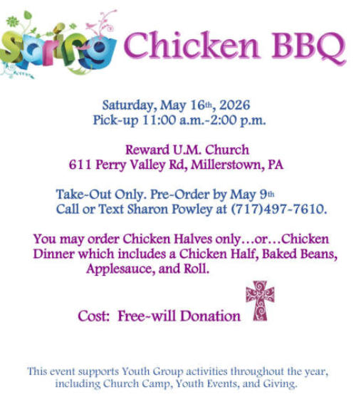 Reward U.M. Church Youth Chicken Bar-B-Que on May 16, 2026 – 11:00 a.m. to 2:00 p.m. Pick Up at the Church